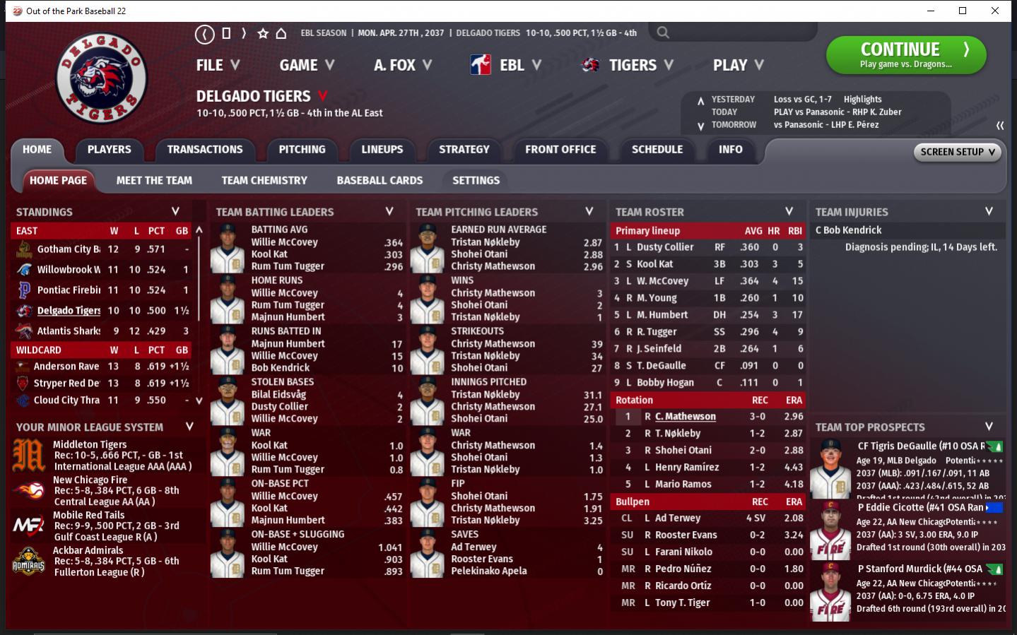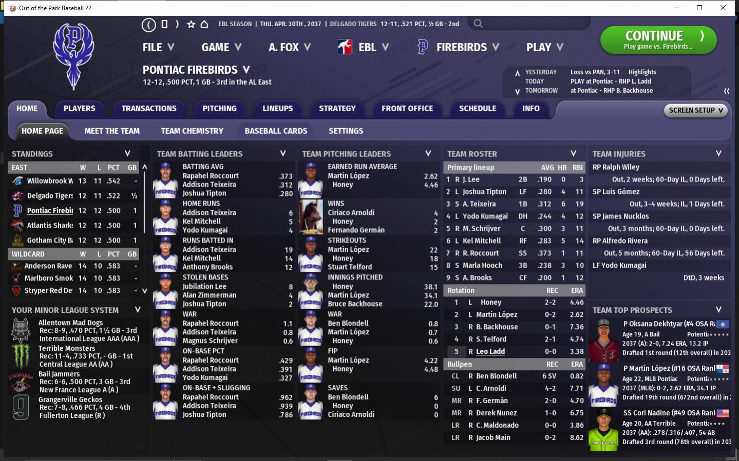 12-12 .500 1 GB AL East We are 2-1 vs the Firebirds this season. So far the Firebirds are a .500 team. They have good parts and bad parts to their team. Teixiera, Tipton, Schrijver, Mitchell & Roccourt are doing great on offense. Lopez & Blondell are the only P doing really well. I am looking forward to getting out of April and away from The Tigers Den. We could do well in this park offensively. Boskovic will return on May 1st.