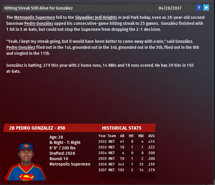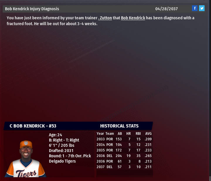 Delgado C Bob Kendrick will miss 3-4 weeks. Metropolis 2b Pedro Gonzalez has a 25 game hitting streak. Portland Rf Nick Fury will miss another 5 weeks.