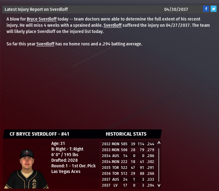 Las Vegas Cf Bryce Sverdloff will miss 4 weeks.