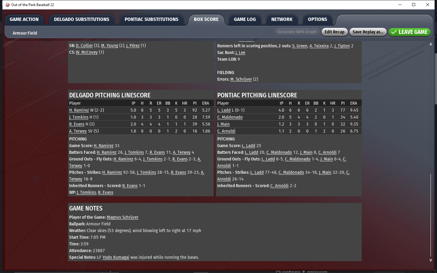 This was a slugfest. Ramirez, Tomkins & Evans all pitched poorly. Terwey pitched well enough for the Save. HR: McCovey (6), DeGaulle (1), Kat (4) & Humbert (4) SB: Collier (3), Young (2) & Perez (1)