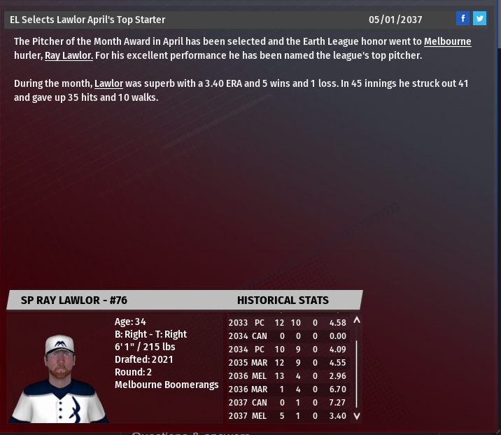 Montreal SP Joe Sheare is named MLB NL POTM for April. Melbourne SP Ray Lawlor is named UBL EL POTM. Anakin Sp Matthew Westacott is named GL POTM. Atlantis 1b Dan Lincoln is named EBL AL BOTM.