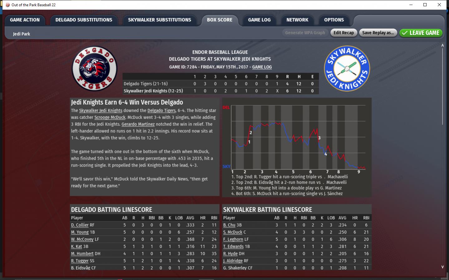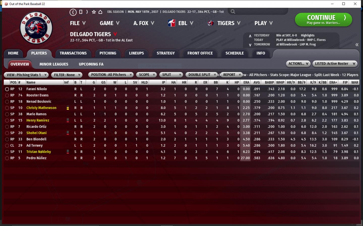Otani had a some walk issues but only gave up 4 hits and the defense and offense were superb. I put Seinfeld in the #2 slot since he's hitting .345 vs LHP despite being 2-7 vs Self. I was going to bench Kat but Tugger needed a day off and I didn't want Broadbent in vs LHP. Ortiz pitched well in relief. HR: Seinfeld (4) Kat (12) SB: Kennett (3) Collier (6) 3 double plays.