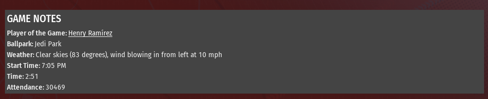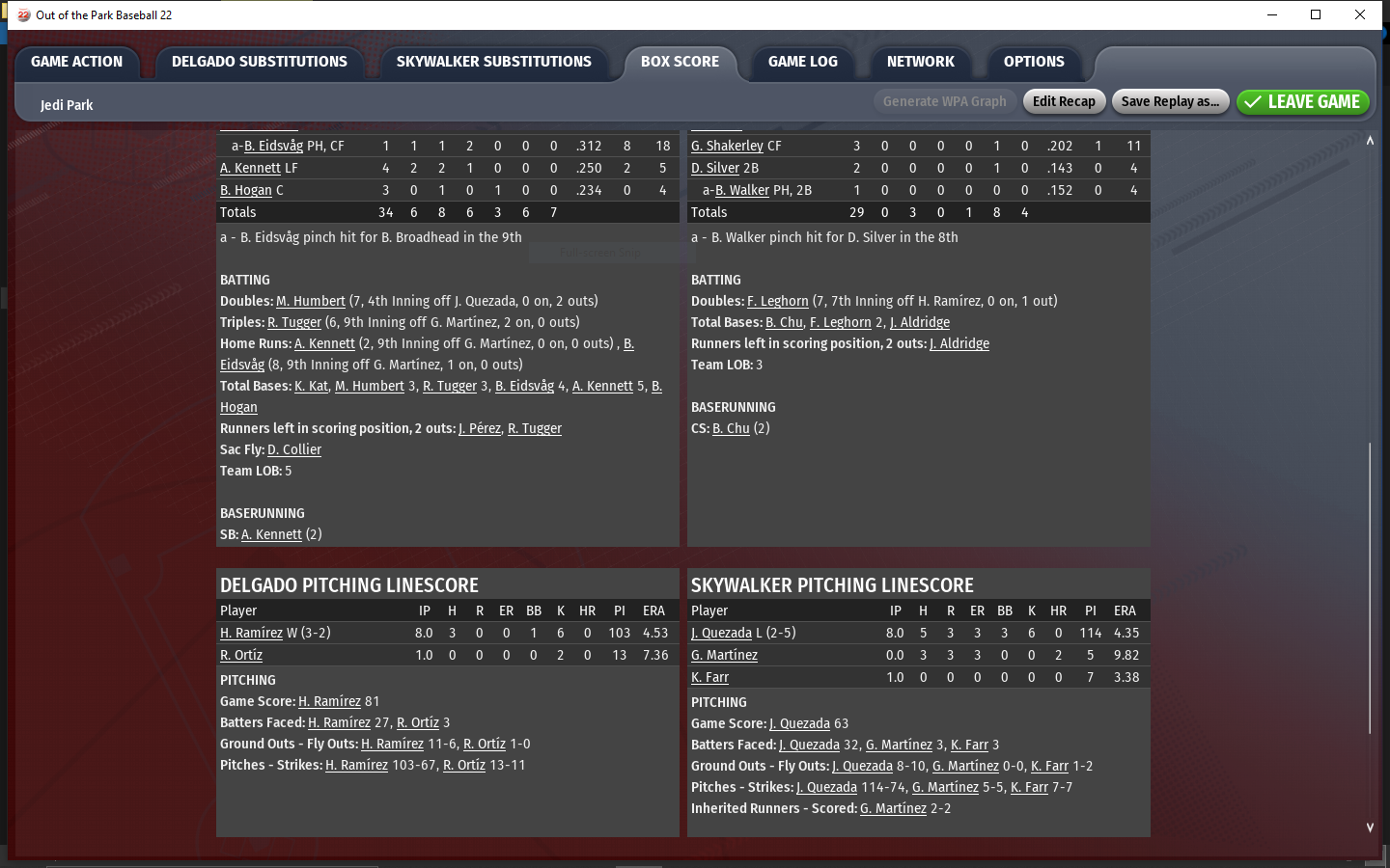 Ramirez pitched his best game of the season. We needed that badly. Offense woke up in the 9th. HR: Kennet (2) Eidsvag (8) SB: Kennett (2)