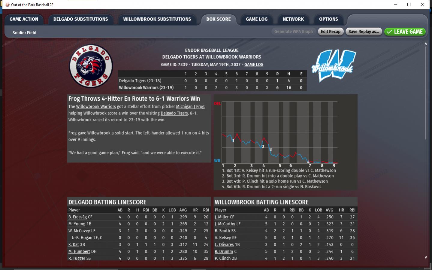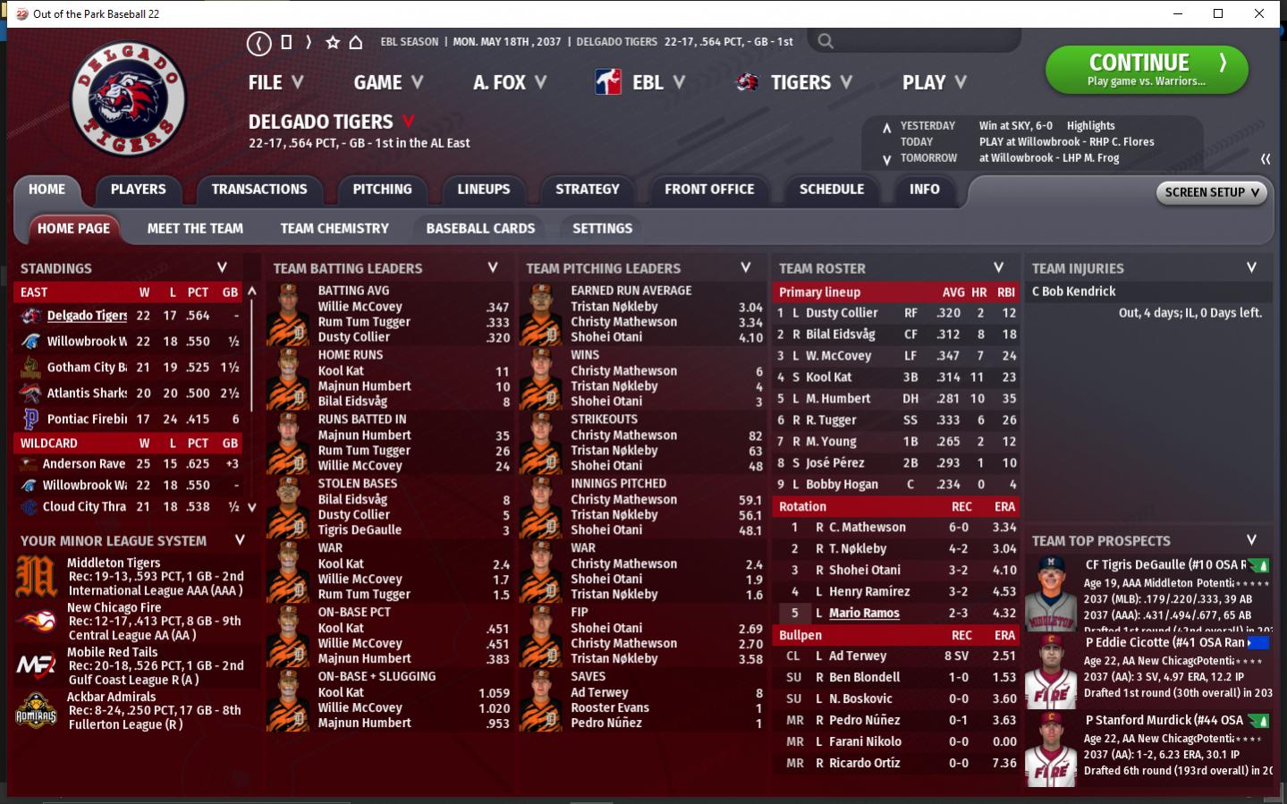 22-18 .550 ½ GB AL East We are 0-3 vs the Warriors this season. The Warriors seem to always be in the race, especially vs us every year. They were predicted to be below .500 but i knew they would be good. Whether or not they can hang with us all season has yet to be determined but Frog & Self anchor this staff and are doing well. The rest of their rotation is beatable. Their pen is good to a degree but not as good as in the past. Dostie, Orban & White are good. Offensively Kelsey, Smith, Miller & McCarthy are carrying them but Holden & collier are good also. We need to at least split the series to stay in 1st place.