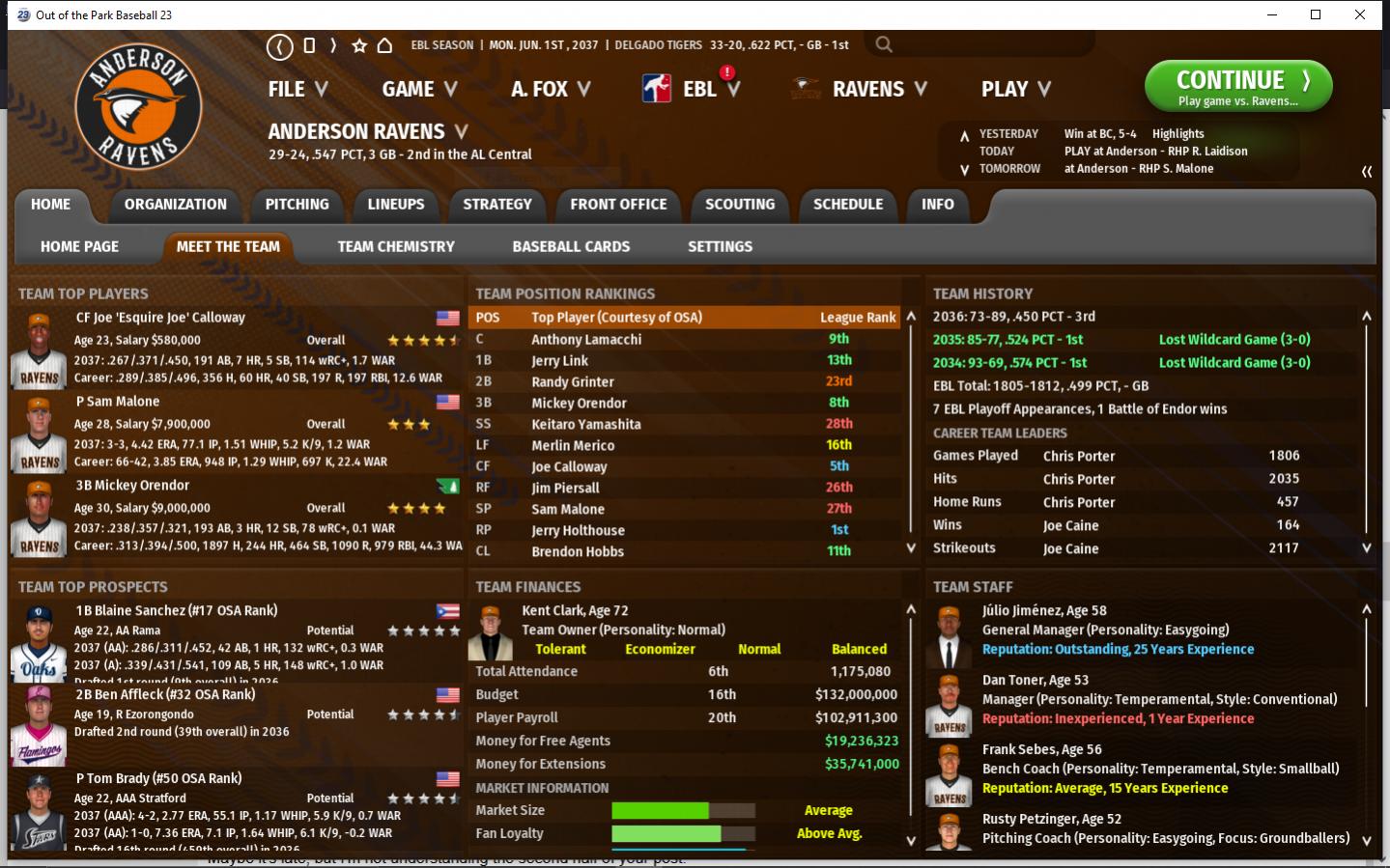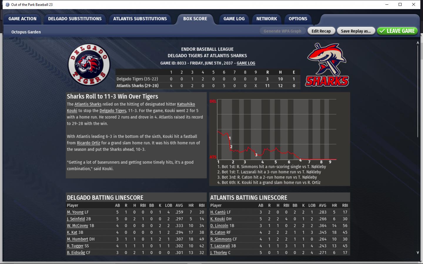 28-28 .500 7 GB AL East We are 4-2 vs the Sharks this season. The Sharks will be without Walter Johnson for almost 2 months and as it is they are struggling. They need players to step up if they want to get back into the wildcard race. They recently brought up RP Trent Noland. Noland was great for me while with Willowbrook.