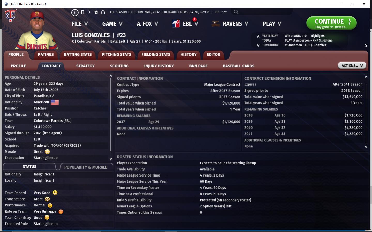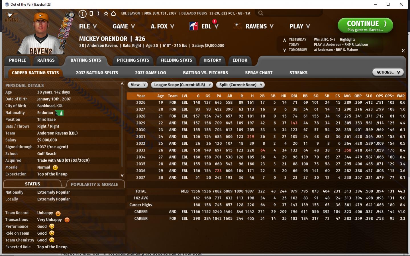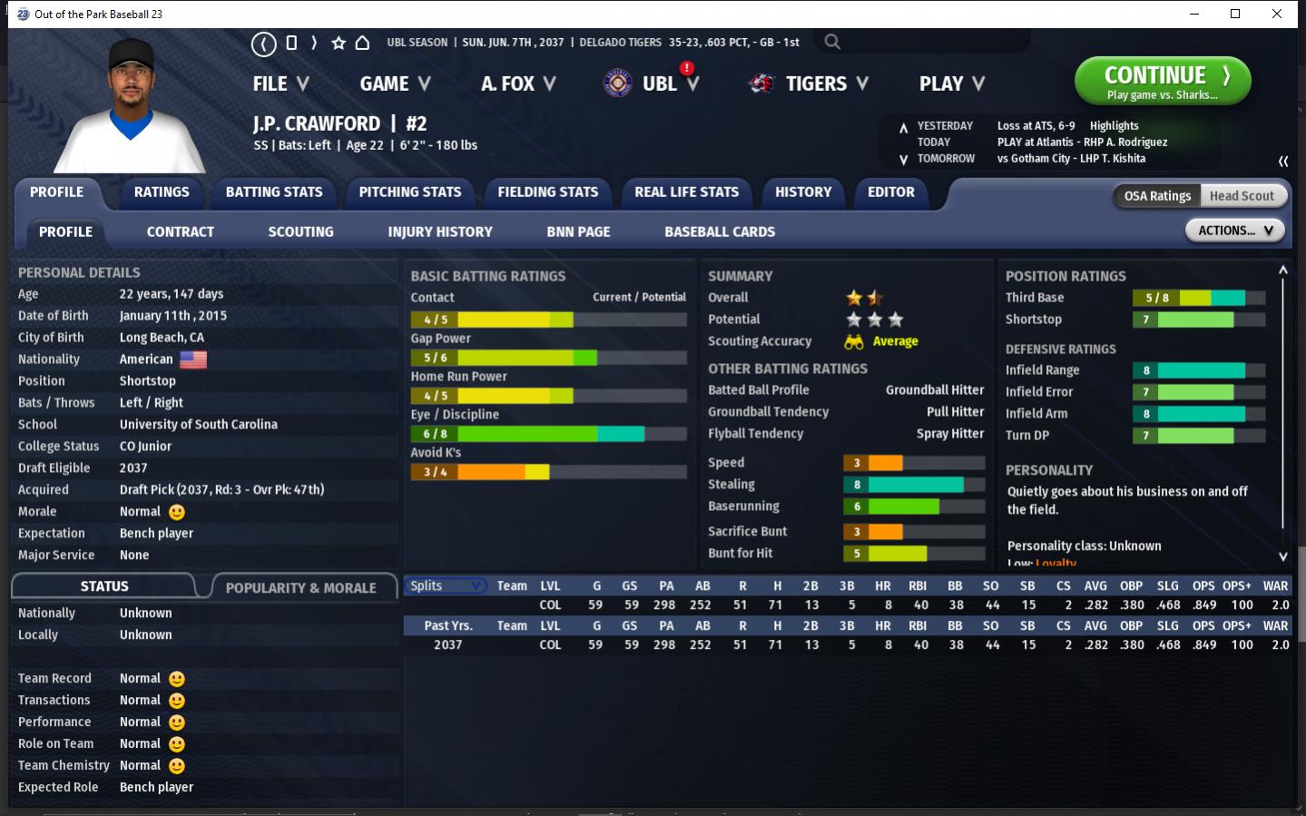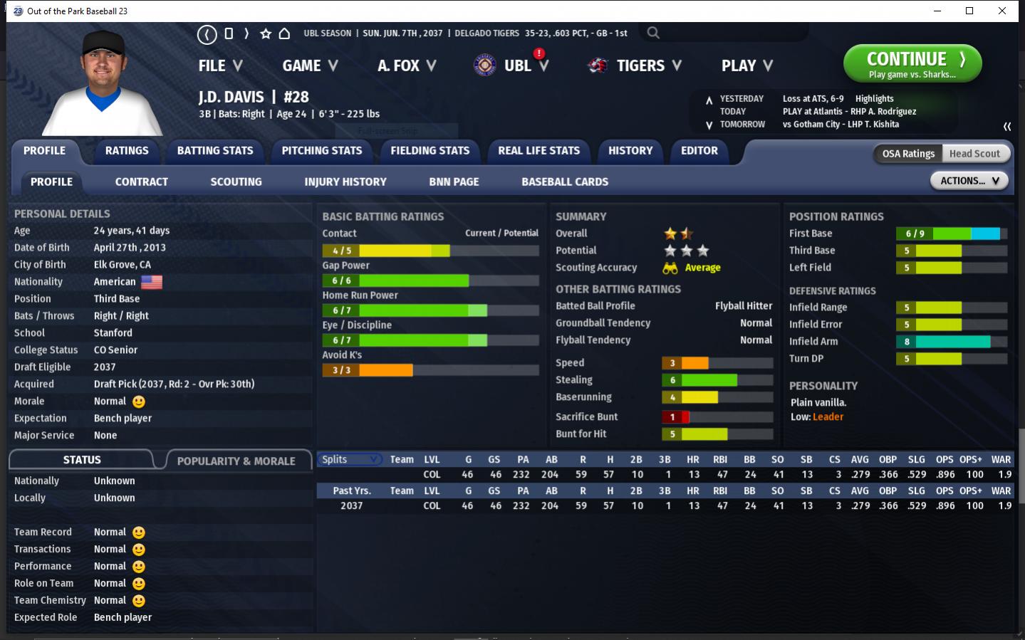 In my opinion, we had a very good draft. We drafted heavily on the pitching side and I believe we have 3/5 (Harden, Sain & Olvera) of the 2041 rotation in this draft. We got 2 good Catchers (Shafrov & Flores), either of which could be a backup to Kendrick by 2040, '41. We have 3 RP in Pagan, Chirinos & Cimber that could play for Delgado this season or in 2038. Cordero could be a 4th OF as soon as 2038. Wells as a huge upside and could develop into a 4th/5th SP or a really good bullpen arm. I drafted several leaders that will help any clubhouse and a few pranksters to keep the clubhouse loose. How many of them will ultimately play in Delgado, only time will tell.