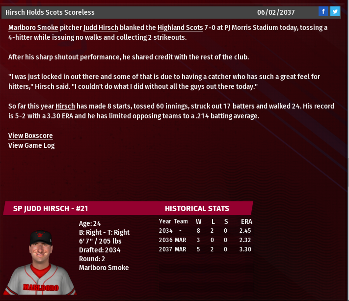 Marlboro SP Judd Hirsch pitched a 4 H 2 K CG SH.