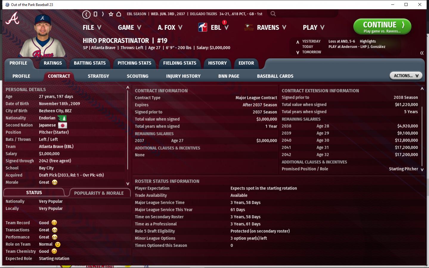 Lake Venus SP Cisco Sanchez will miss 13 months. Atlanta Brave sign SP Hiro Procrastinator to a 5 yr extension.