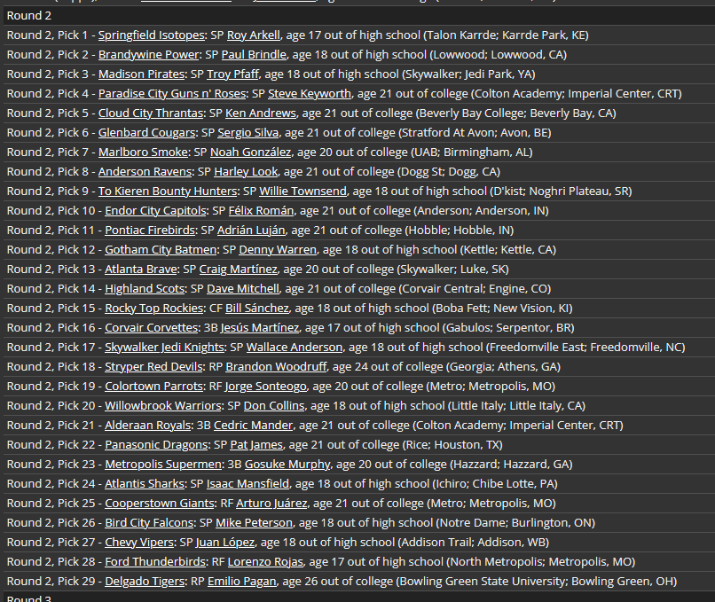 Round 1 #1 Stephen Richardson, SP, BAL - Looks be a be a future ace, although his velocity is a bit slow for the era. #4 Matt Chapman, 3b, LV - Chapman could start this season at 3b and be a staple at the hot corner for 15+ years. #28 Paul DeJong, CHA - While they have a great SS in Will Gray, DeJong could join this team in the near future and at least backup Gray. Round 1s #8 Rhys Hoskins, 1b, WAS Hoskins has ligth tower power and could play for the Nats as early as next season. Round 6 #6 Cool Papa Bell (clone)Cf, ATL Braves get a gem in Bell. He can play 4 positions, steal bases and hit for high AVG. He'll start Day 1 after he signs.