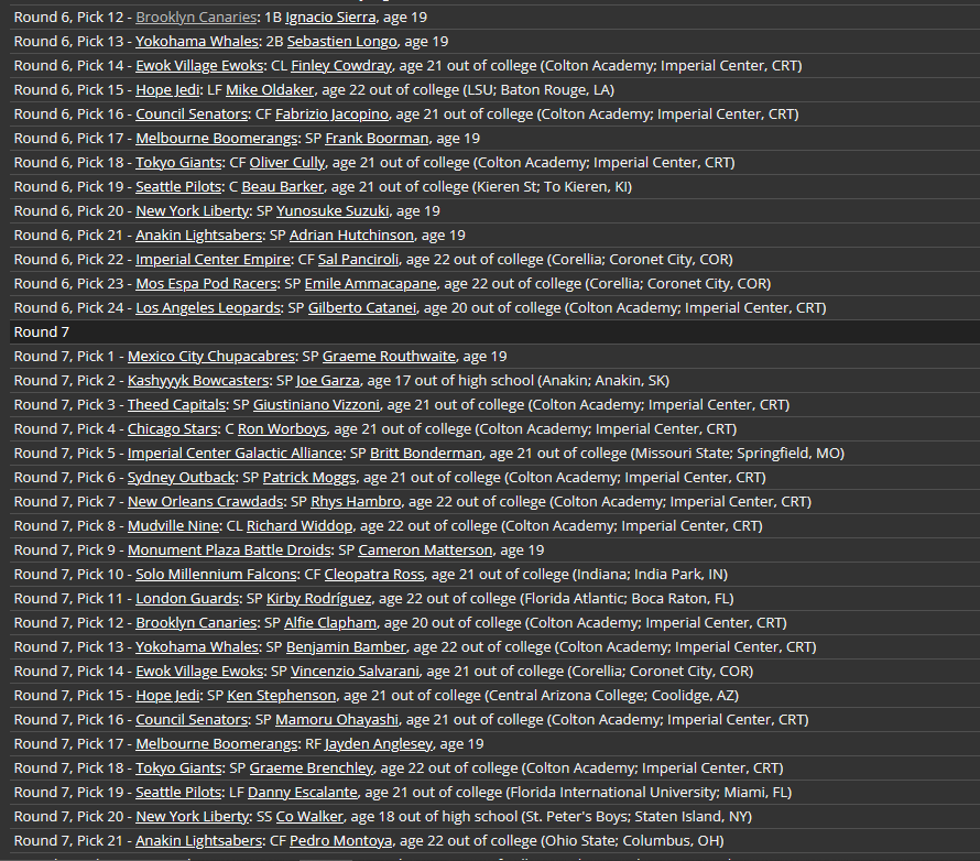 Round 1 #1 Lou Gehrig (clone) 1b, MC - Will be a superstar in the near future. Probably the 2038 EL ROTY. #8 Kar Kar Binks SP, MUD The great nephew of disgraced Jar Jar Binks. He is a future ace and should be a star for a long time. Round 2 #2 Mitch Garver C, ME Just an average C. #7 J. D. Davis, 3b, MUD should be a very good 3b in a season or 2. Round 3 #1 J. P. Crawford, SS, MC Good defensive SS that should hit a bit.