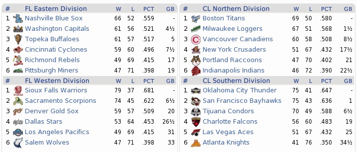Despite their mediocre record, the Capitals were still in the running for a playoff spot, trailing the Blue Sox by only four games coming in. They had lost four games in a row, though. Their strengths were with offense, in which they ranked third in the Federal League, while their pitching at times would fall apart, giving them a -10 run differential, with the fifth-most runs allowed. Their bullpen was especially porous, ranking 10th in the FL. However, the Raccoons were considerable worse in every aspect… Projected matchups: Randy Farley (11-8, 3.45 ERA) vs. Vernon Robertson (10-6, 5.00 ERA) Ralph Ford (6-12, 4.34 ERA) vs. Chad Wright (7-6, 3.88 ERA) Miguel Lopez (5-12, 5.13 ERA) vs. Takeru Sato (9-9, 3.22 ERA) We know Robertson, but I am not sure whether we have played against the 26-year old right-hander Wright and the 27-year old southpaw Sato before. Game 1 WAS: SS J. Lopez – 3B R. Gonzalez – CF V. Sanchez – LF J. Rivera – RF Calzado – 1B C. Solís – C W. Turner – 2B McFarland – P Robertson POR: SS Guerin – 1B Martin – 3B Sharp – RF Brady – 2B Ingall – CF Parker – LF Richardson – C Jackson – P Farley The attendance got treated to a pitcher’s duel in the series opener. Robertson and Farley traded goose eggs through five innings, with Farley not even giving up a hit through six. The big question was whether Farley could get any support in his bid, and the answer would turn out to be affirmative, even if he didn’t get much to work with. However, Daniel Sharp put up a 1 for the Raccoons with a home run in the bottom 6th. Farley was back out for the seventh, got Ramiro Gonzalez, before Victorino Sanchez grounded to the right side, far to Ingall’s left. Ingall launched after it, barely got a glove at it, scrambled up and – didn’t make a throw. Sanchez was safe already. Solís singled to start the eighth, but Turner – always the killer when it came to offense – hit into a double play. Robertson went eight, whiffing nine, and Farley went back out for the ninth (remember how good our closer is) on 99 pitches and facing PH Tony Diaz to start the frame. Farley got to 1-2, then had one get away and hit Diaz. Tying run on base, we began to sweat. Jose Lopez came up and hit a hard shot to short, bouncing once as it hit the warning track. Guerin refused to be eaten up by hit, smothered it, lobbed to Ingall, and they turned the double play. That left Ramiro Gonzalez to bother about, and he grounded out to Guerin as well. 1-0 Coons! Sharp 1-4, HR, RBI; Ingall 2-3; Farley 9.0 IP, 2 H, 0 R, 1 BB, 8 K, W (12-8) and 1-3; RANDY!!!! I LOVE THIS KID!! After his fifth career shutout and tenth complete game in 88 starts, Randy also reaches 12 on the year, and is one win away from his career best (13-13 in 1999). Also: DANIEL SHARP!! We gave Paco Martinez the callup. He had started the same day, pitching seven innings of 2-run ball in a 5-2 win for St. Pete. Game 2 WAS: 2B T. Diaz – 3B R. Gonzalez – CF V. Sanchez – SS J. Lopez – LF J. Rivera – 1B C. Solís – RF McFarland – C W. Turner – P Wright POR: SS Guerin – 3B Sharp – 1B Martin – RF Brady – LF Parker – 2B Ingall – C Mata – CF Kent – P Ford The Raccoons scored three runs in the first inning when Wright looked like he wouldn’t go very deep, but then settled into a groove quickly. Ford went the other way, not allowing a hit through to the third, but then quickly coming apart with control issues. The Capitals drew four walks off him in five innings, and tied the game in the fifth. Ford struck out six in six innings, but could not get back in line for a W, and needed 117 pitches for six frames. The Coons were locked out of the game by Wright entirely after the first inning. While Blanco and Reyes pitched scoreless innings, Donis fell to a leadoff double by Tony Diaz in the ninth. Diaz came around to score, while Jesus Longoria replaced Wright. He walked Martin to start the bottom 9th, who was run for by Newton. Brady and Parker both made outs, moving Newton to third. Now we needed an Ingall single, but we got a pop to shallow right that Vonne Calzado caught leisurely. 4-3 Capitals. Martin 2-3, BB; Sigh. Would have been nice to pick up an actual hit at some point in the ninth. The last of our five singles came in the third inning. Game 3 WAS: 2B T. Diaz – 3B R. Gonzalez – CF V. Sanchez – SS J. Lopez – LF J. Rivera – 1B C. Solís – RF McFarland – C J. Rivera – P Sato POR: SS Guerin – 1B Martin – 3B Sharp – RF Brady – 2B Ingall – CF Parker – C Mata – LF Richardson – P M. Lopez Another game in which the music started to play mostly on the silent keys – neither team got a hit until Guerin’s 2-out single in the bottom 3rd that led to nothing at all. The Capitals had two hits in the fourth, didn’t score, and the Coons lined up three singles in the bottom 4th to go up 1-0 before Lopez flew out to leave the bases loaded. But Sato began to lose it. The Coons loaded the bags once more in the fifth, and then Parker drew a 2-out walk in a full count to push home Guerin with a run, and Mata singled home a pair on a grounder that Lopez missed by fractions of an inch. The Capitals didn’t know how to break up Lopez, not even when Guerin made a critical error in the sixth that put a runner on third. Bottom 7th, Pancho Padilla appeared in relief for the Capitals, and loaded the bases quickly with walks to Brady and Parker and sandwiched between those a toss into Ingall’s thigh. Padilla would not retire anybody as the game got out of hand for the Capitals: Mata singled home another pair, 6-0, and then Richardson hit an RBI single, which prompted an appearance from Alonso Villegas. When the Capitals actually did get to Lopez he was smashed into pieces instantly: four hard hits in the top 8th knocked him from the game. Nordahl allowed a runner left on by Lopez to score, and the Capitals got back within slam range. Having just blown a huge lead a few days earl
