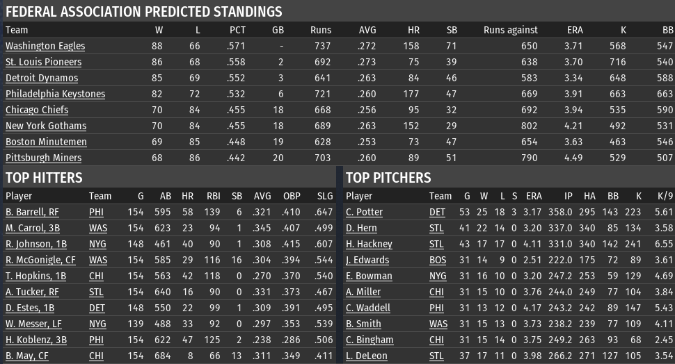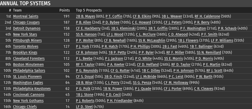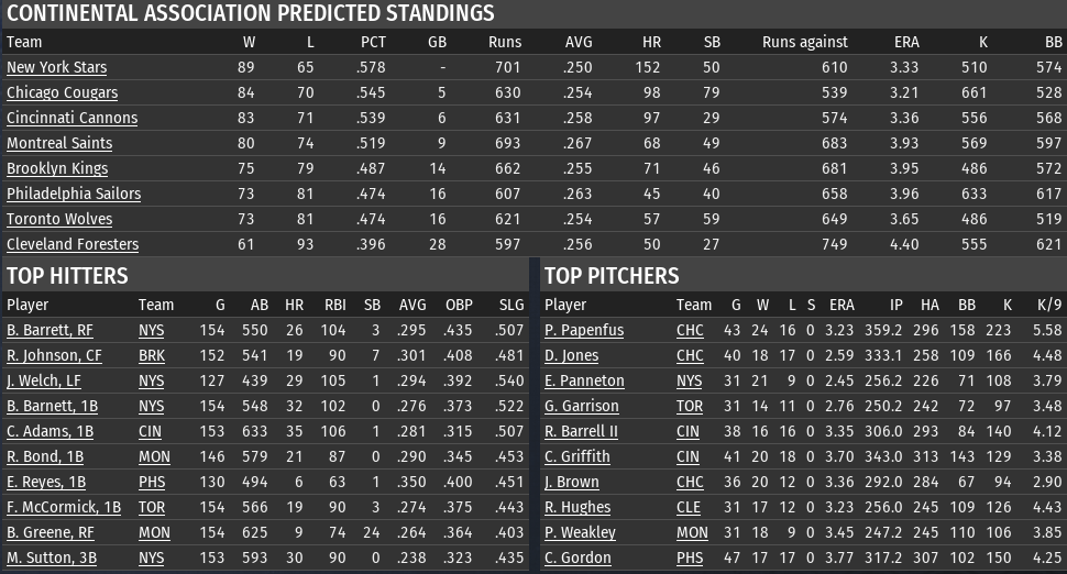 For Chicago sports fans, the timing is almost perfect, as one season ended, another begins. The nearby Chicago Packers, just like nearly all Chicago teams, saw their season end in heartbreak, dropping game six and seven of the Challenger Cup to the juggernaut Boston Bees, who have defended their title and captured their fifth in seven years. The Packers star studded first line of Wes, Tommy, and Marty was down to just Tommy. Mahoney and the elder Burns joined defensemen Jerry Finch first line players who missed the finale, while forwards Jarrett McGlynn and Norm Fraser missed time during the postseason. When healthy, the Packers could outscore anyone and everyone, but the three players down totaled 132 points in the regular season. I thought this was the year for Chicago, as Whitney College won the AIAA tournament, the first major playoff of 1947. But with the Packers loss, at least we don't have to ruin the streak when we inevitably end the season looking forward to next year. The Cougars have all the pieces to make a title run, but it seems like something comes up each season. OSA believes the Cougars are destined to come short of the Stars for the second straight season. The rest of the league believes the Cougars will take first, but the Fed has a more open field. Really anyone could take the crown, but the favorite seems to be Billy Riley and the Eagles coming out on top. It's anyone's guess who wins, as no one picked the Eagles last year, and a few injuries or big acquisitions can shake up a pennant race in an instant. We have the depth to survive most injuries, we're already handing Harry Parker being out just fine, and I know the twenty four players below are not going to be the same twenty four that finish the season in Chicago: RHP Joe Brown LHP Duke Bybee RHP Mel Haynes RHP Donnie Jones LHP Johnnie Jones RHP Charlie Kelsey RHP Harry MacRae RHP Ken Matson RHP Pete Papenfus C Homer Guthrie C Eddie Howard 1B Ray Ford 1B Dick Walker 2B Billy Hunter 3B Jim Jenkins 3B Walt Pack SS Skipper Schneider SS George Sutterfield LF Leo Mitchell LF Joe Read CF Carlos Montes CF Ray Struble RF Don Lee RF Hal Sharp We made some tough choices, starting with sending Red Hampton back to the Cannons. His stuff is great, but the control is not there yet and I can't see him lasting the whole season on the big league roster. We need someone we can send back down when the double headers come around, and I really like Mel Haynes. The former 1st Rounder never really got a chance in Brooklyn, and while I wouldn't pitch him against the Stars, he could get a spot start in a favorable matchup. I also couldn't send Charlie Kelsey down, as he was literally the only guy on the entire staff to get outs. The 25-year-old starts the season as the 125th ranked prospect in the league, and has a good chance of graduating from that list this season. Like Haynes, he could also get a spot start, but he is just really good out of the pen. He excelled at it in the minors and even in his time in Chicago last season, so if he's on it to start the season there's no need to swap his role. Eddie Howard will start the season in the minors, as we don't really have many starters ready to pitch in Milwaukee. The game really likes him as a starter, so it's worth letting him pitch every sixth day. Howard went 5-4 in the CWL with a 3.86 ERA (100 ERA+) and 3.28 FIP (85 FIP-). It was the first time he started as a professional, but with the war last season was his first since 1942. I'm not sure how many starts he'll get this year, but as long as his offense doesn't suffer he'll keep making starts. With Clark Car out to start the season, we'll get at least a week to see Joe Read, who didn't have the greatest of springs. The 22-year-old can play all three outfield positions if needed, and he has a pretty decent bat to go with it. It may be tough for him to stick all season, as the only optionable players left are George Sutterfield, Don Lee, and Homer Guthrie, meaning unless an injury comes up, we're going to have to risk losing something. Car might need a week to get back on track, as he may miss almost a month. Right now it looks like Read is the 24th man, as the Walt Pack addition may have pushed Read out of a spot. Our farm system has dropped four points below the Saints after the trade of Pat Todd and Duke Bybee dropping a few spots to 10th. Bob Allen checks in as the 2nd best prospect, and after him and Bybee we have seven more in the top 100, 27 in the top 250, and 53 in the top 500. Our system is very deep, but we'll be graduating some guys and I'm not sure how many of our draftees will join the remaining ranked prospects. I like our picks, but you never quite know how the game is going to order them, and what changes happen between now and the official draft. I'm hoping we add at least two top 100 prospects in Jerry Smith and Garland Phelps, but the recent class was a deep one. The season starts in Chicago with a highly anticipated pitching duel between last year's Allen and Kellogg winners. Cougars Park could be sold out as Pete Papenfus (21-8, 2.39, 199) will take on Leo Hayden (19-12, 2.95, 130) and the new look Kings. Hank Barnett (.236, 14, 61) will make his Kings debut in Chicago and we'll have to deal with offseason acquisitions Buddy Long (16-16, 2.89, 95) and Juan Pomales (.266, 2, 47, 10) as well. When I was talking about the CA not having many lefties, that was before Buddy Long changed addresses, and we'll have to deal with him or Hayden a second time with a game in Brooklyn to finish the week. They have an early double header against the defending champs on Saturday, which could effect their rotation. The lineup has some additional new faces, with Leon Blackridge (.246, 3, 38) manning second and top 100 prospect Billy Bryant debuting on Opening Day at short. #4 prospect Ralph Johnson (.293, 3, 16) will hit 4th behind former 4th Pick John Moss (.246, 5, 31). The Kings are going to be much better this season, but I thin