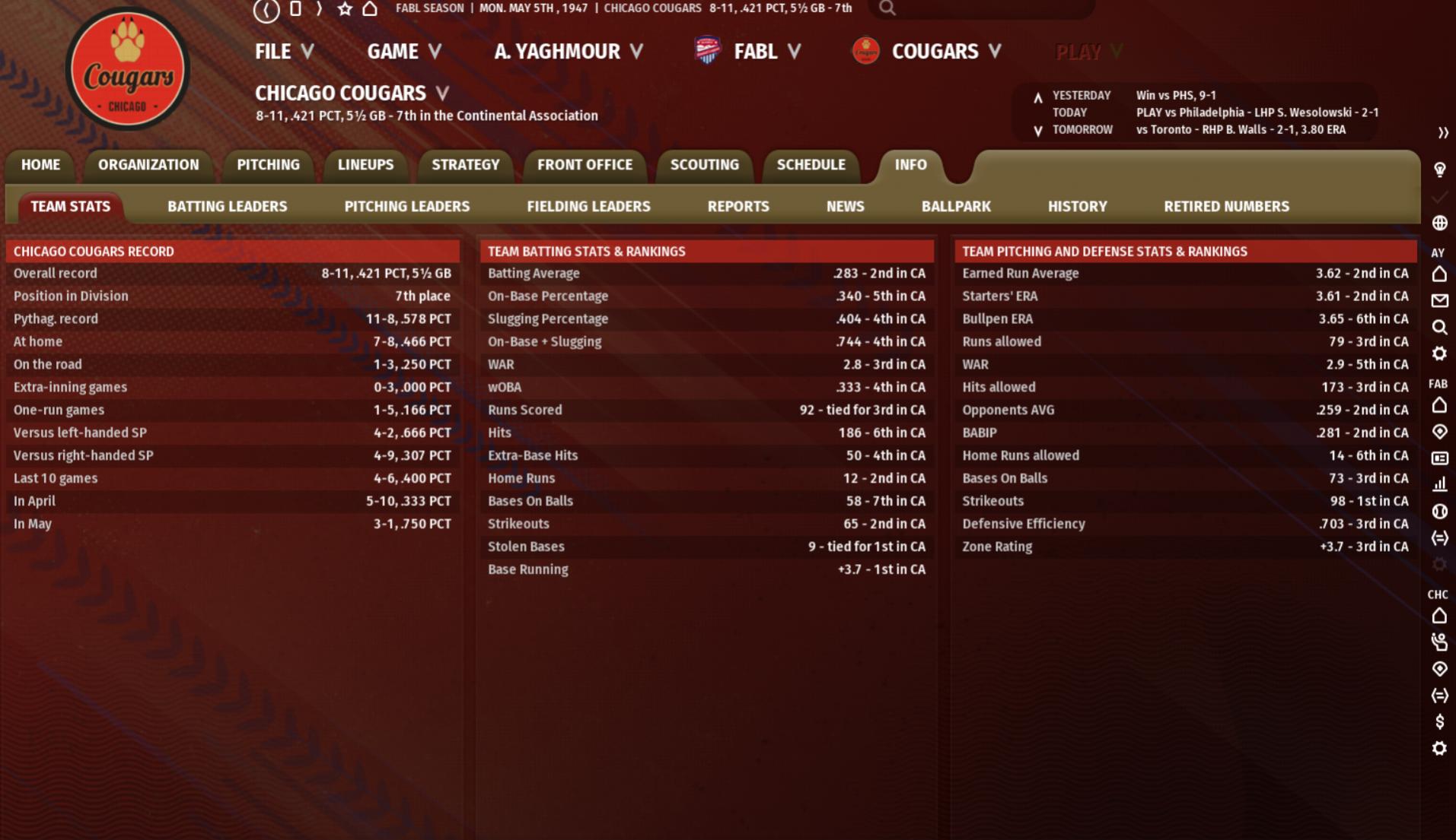 Seasonal Record: 12-16 (t-6th, 6 GB) Stars of the Week Hal Sharp : 34 AB, 11 H, 0 HR, 4 RBI, .324 AVG, .735 OPS Billy Hunter : 23 AB, 8 H, 1 HR, 6 RBI, .348 AVG, .906 OPS Ray Ford : 14 AB, 7 H, 0 HR, 2 RBI, .500 AVG, 1.205 OPS Schedule 5-5: Win vs Sailors (3-6) 5-6: Win vs Wolves (1-4) 5-7: Win vs Wolves (1-3) 5-8: Loss vs Wolves (7-0) 5-9: Win at Stars (7-4) 5-10: Loss at Stars (3-10) 5-11: Loss at Stars (1-3) 5-11: Loss at Stars (4-5) Recap We're never going to have a winning week, huh? The week actually started well, as we started by finishing the sweep against the Sailors before finishing the homestand by taking two of three from the Wolves. We even won the opener at Dyckman Stadium, but from then on our it was all Stars, as they took the final three, including our 6th one run loss in 7 attempts. I don't think that's ever going to get any better, so we're going to need to find more creative ways to win as we're already six games behind the 18-9 Cincinnati Cannons, who share the best record in FABL with the surprise St. Louis Pioneers. Somewhat surprisingly, the Cannons have the best pitching in the league, as 40-year-old Red Hampton (4-1, 2.31, 5) is pitching out of his mind while Les Bradshaw (3-2, 2.41, 17) is copying his season last year where he started out red hot before his inevitable return to form. We're still way off the pack, tied with Montreal for sixth, and we'll be on the road all week which won't make things any easier. I was worried about Johnnie Jones having to face the Stars, but he picked up the lone win in the series. Sure, he gave up his fourth homer, and allowed 8 hits, 4 runs (2 earned), and 5 walks, but he got all but two outs in the 7-4 win. Ken Matson picked up save #3, walking and striking out one with the third batter flying out. The Stars gave Pete Papenfus probably the worst start of his career, launching three longballs in 4.2 innings, as Pap allowed 6 hits, 8 walks, and 10 runs with just a single strikeout. His ERA jumped from 3.15 to 4.84, and his game score was single digits; just five! I'm not sure Pap has ever pitched this bad, and he was far better against the Sailors where he picked up a complete game win with 7 hits, 3 runs, 3 walks, and 3 strikeouts. The lack of strikeouts from our ace has been concerning, as he's punched out just 23 hitters in 44.2, and now he's walked (28) more guys then he's struck out, something our Golden Arm hasn't done since he was a 20-year-old rookie nearly a decade ago. Even though they lost, Donnie Jones and Joe Brown faired much better in the double header, and each picked up a win earlier in the week against Toronto. Donnie went 8 in the loss, allowing 7 hits, 3 runs, and 4 walks with 7 strikeouts. Strikeouts aside, he was far better against his former team, picking up a complete game win with 6 hits, 2 walks, a single run, and 3 strikeouts. Brown was brilliant in both starts as well, but he was not charged with the loss in New York as he went just 7 on short rest. The 33-year-old allowed 8 hits, 2 runs (1 earned), and 3 walks with 3 strikeouts before Ken Matson fell apart. He allowed 2 hits and a walk in the 8th, with all three runs scoring on Bob Riggins' (.299, 3, 16, 2) pinch-hit go ahead homer. Matson actually saved Brown's win with a perfect ninth after the veteran went 8 with 8 hits, a run, a walk, and 5 strikeouts. The last start of the week went to Duke Bybee, who once again was hit hard. The Wolves got 7 hits and 7 runs (5 earned) with a walk and 3 strikeouts in his 6 innings. The rookie has allowed 6 or more runs in three of his four starts, as his 5.23 ERA (78 ERA+) is inflated by his 1.5 HR/9. He's struck out 17 hitters in 31 innings and sports a strong 1.89 K/BB so far, so you have to imagine he'll find a way to limit the longball. We didn't do much hitting this week, but Ray Ford continued to pulverize Continental Association pitching, hitting an even 7-for-14 with a steal, run, and two doubles, walks, and RBIs. Other then him, it was really just Billy Hunter who contributed, as Walt Pack's replacement went 8-for-23 with a double, homer, 2 walks, 4 runs, and 6 RBIs. Pack actually made two plate appearances late in the week, picking up a walk and single. Backup catcher Homer Guthrie looked good in his three starts, 3-for-6 with a double, 2 runs, and 5 walks. Even Mel Haynes was better then the rest of the lineup, as the reliever went 1-for-2 when mopping up Pap and drove in two with an RBI single as we stretched a win streak to five. But as fun as it is when Haynes hits, we need Leo Mitchell to hit, as the veteran went just 6-for-31 to drop his season line to .299/.339/.393 (95 OPS+). It's no surprise that when our stars our struggling the team is struggling, and if Mitchell and Pap don't get going, I imagine the Cougars will once again disappoint their fanbase in what could be a very long season. Looking Ahead We get a much needed off day to start the week, as we've played 27 games in the past 27 days. Our next stop is Cleveland for two with the Foresters, the only team with a worse record (11-19) then us in our association. The Foresters haven't hit or pitched much, ranked 7th in both runs scored and allowed so far. The lineup has been shuffled a bit, with Bill Sikorski (.299, 2, 6), Bob Corvin (.315, 5), Dixie Galloway (.207, 1), Hank Stratton (.288, 5), and Chuck Harrington (.222, 2) all entering the lineup, but the quartet each own an OPS+ below 100. Same goes for Orie Martinez (.220, 3, 14), and one of their only productive hitters, the talented Jim Adams Jr. (.295, 1, 10, 2) fractured his knee and may be done for the year. That's huge blow for Cleveland, as not only is he their best player, and one of the best in the leagues, but the former #1 pick has tremendous upside and is coming off back-to-back 3 WAR seasons. Making matters worse, it was not an injury while playing, as it was suffered as he fell down a flight of stairs while moving a couch into his new house. Hire some movers man! The pitc