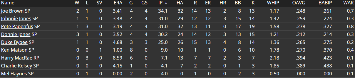 Seasonal Record: 5-8 (8th, 3 GB) Stars of the Week Hal Sharp : 20 AB, 9 H, 2 HR, 6 RBI, .450 AVG, 1.322 OPS Leo Mitchell : 29 AB, 10 H, 0 HR, 6 RBI, .345 AVG, .780 OPS Clark Car : 20 AB, 7 H, 0 HR, 0 RBI, .350 AVG, .858 OPS Schedule 4-21: Win at Kings (6-1) 4-22: Loss vs Stars (5-4): 14 innings 4-23: Loss vs Stars (9-8) 4-24: Loss vs Stars (8-6) 4-25: Loss vs Saints (1-0) 4-26: Loss vs Saints (10-4) 4-27: Win vs Saints (1-2) Recap The Cougars are quickly in midseason form, dropping three one-run games this week as we slip to 5-8 and last place in a tight Continental Association where all eight teams are within three games of each other. We lost our first four one-run affairs before finally beating the Saints 2-1 to snap a five game losing streak. Not only was it the first one-run win in five games, but also our first win against Montreal in five games. The Stars beat us in all three in Chicago, while we earned the split in Brooklyn before returning home for what has been a rough homestand. We've still scored (62) more runs then we've allowed (59), as the close games seem to never break in our favor. We'll have to get back on track without Carlos Montes, who after playing in a career high 148 games last season, decided it was time to return to being the guy who always gets hurt. He'll be battling a rotator cuff strain that should keep him out of action for at least three weeks. He has drove in a team high 11 runs and hit .283/.314/.478 (106 OPS+) in his first 52 trips to the plate. I wish I rehabbed Clark Car, although his 7-for-20 week would have been missed, so we could have hung onto Joe Read and used Montes' spot for Car's return. Instead, we'll bring back center fielder Max Rucker, who cleared waivers along with Fred Vargas. I don't expect the 29-year-old to get into many games, and he'll probably be DFA'd again when Montes comes back, but Ducky Cole is dealing with a calf strain in Milwaukee and there's no need to bring up Johnny Peters as a temporary fix. Don Lee will shift from the short side of our right field platoon to center, making our outfield far weaker then usual. He has the range to be passable, but it's a big downgrade from Montes, and his excellent defense in right (19-for-19, 1.056) will be missed. This will force Hal Sharp to face more lefties (hasn't faced one yet), who is hitting a beautiful .438/.486/.688 (206 OPS+) this season. Him and Leo Mitchell are not very good defenders, so there may be a lot more balls finding holes until Montes is ready to return. The pitching has really disappointed, and Johnnie Jones and Duke Bybee again had rough starts. Both allowed 6 earned runs, 3 homers, and 5 walks with 4 strikeouts, as Bybee got one more out (7.1 vs 7 IP), allowed one more hit (8 to 7), and was charged with a pair of unearned runs. Bybee is a flyball pitcher, so homers are expected, but he only allowed 7 of them in 175.1 innings for Milwaukee last season. Jones on the other hand, is "The Patron Saint of Groundballs" and only watched five balls land in the seats in 225.1 innings last season. Against the Stars, homers are expected, as Rabbit Mudd, Chubby Hall, and Joe Rainbow bested Jones, with Hall, Mack Sutton, and Bill Barnett going yard on Bybee. It wasn't all bad, as Peter the Heater looked liked Peter the Heater, despite getting the unlucky draw of facing Saints ace Bert Cupid (2-1, 2.92, 10), who tossed a 3-hit shutout. If Harry Mead didn't make an awful throw allowing a stealing Bill Greene (.234, 1, 3, 4) to reach third, Papenfus would have been working on his own shutout, as the lone run was unearned. He went just 8, allowing 4 hits and 3 walks with 7 strikeouts before Ken Matson pitched a ninth where he struck out two, walked one, and allowed a single. Donnie Jones had a good start and a bad start, as he outdueled Juan Pomales (0-3, 7.50, 5; .370, 3, 4) before getting torched for 8 hits and runs while failing to get out of the fifth. It was his first start where he didn't allow just 4 hits and a walk in a complete game win, raising his ERA and WHIP to 3.18 (137 ERA+) and 1.15 on the season with just as many walks (10) as strikeouts (10). The last two starts went to Joe Brown, who picked up a no decision in the 14 inning game and beat the Saints to snap our losing streak. Brown went all nine in the win, allowing just 6 hits, a run, and 2 walks with 6 strikeouts. He left his first start with one out in the eighth, allowing 10 hits, 4 runs, and 2 walks with 4 strikeouts. Our pen got a lot of work in this week, with all four arms making an appearance. Matson pitched in Pap's start, but also blew Brown's start as he could not strand his inherited runner. He allowed a hit and walk before turning the ball to Harry MacRae. MacRae threw two scoreless with 2 hits, a walk, and 2 strikeouts. Mel Haynes pitched admirably, but again the defense cost us a game. For some reason Skipper was double switched for in the ninth (and as noted above, Matson did not pitch past the 9th), so Billy Hunter was at short, and botched a grounder in the 14th. It came around to score, so Haynes got the loss despite not allowing a hit. Granted, he did walk two, but the former first round also struck out a pair. Charlie Kelsey didn't pitch in that one, but mopped up for Donnie Jones against the Saints. He allowed 7 hits, 2 runs, and a walk with 3 strikeouts in 4.1 mop up innings. I complained about Billy Hunter's defense, but the bat was working, as he went 4-for-9 with a triple, 2 walks, and 3 RBIs. He'll be in line for some starts in right field, as I won't want Hal Sharp facing every lefty out there. Discounting last season where he hit just .203/.269/.287 (61 OPS+), Hunter has posted a WRC+ of 130 or higher in each of the three seasons prior against southpaws. And while his defense in right isn't great, almost anything is better then Hal Sharp. Ray Ford looked good again this week, 3-for-10 with a double, 2 runs, 2 RBIs, and 3 walks while Dick Walker was just 4-or-20. Sure, that came wi