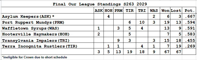 Outside of OL, Ring Road advances to the playoffs as the top seed. The other four OL teams did not make the playoffs and will return to Iron for the 2030 season. |