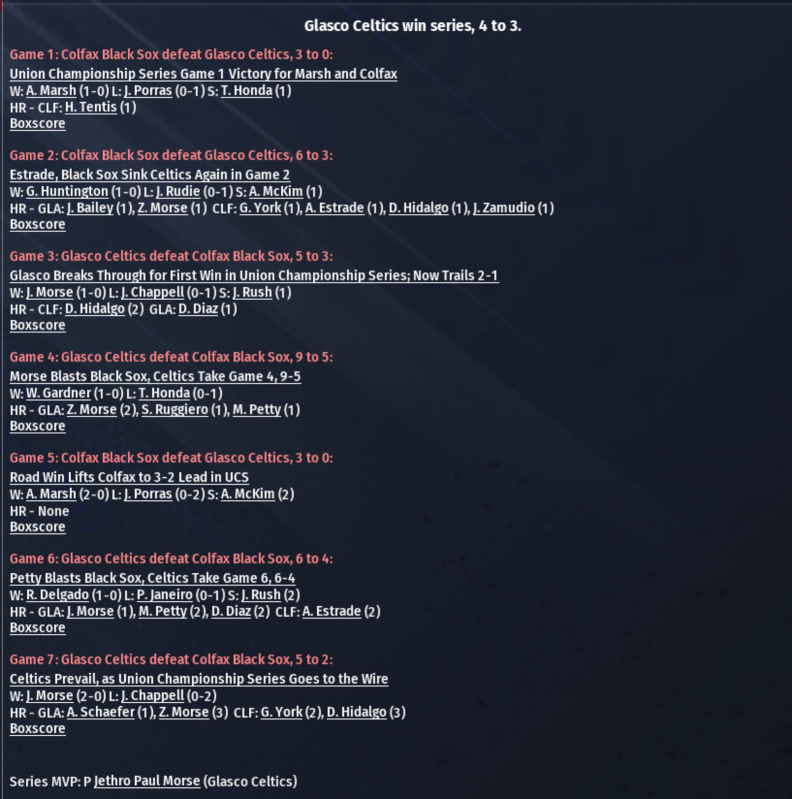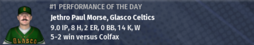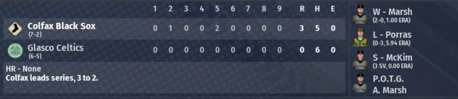 Colfax's quest for a 3rd straight Pro Cup has come to an end, thanks to Glasco and the Morse Brothers. Glasco is going to their 2nd Pro Cup (1879, 1884) and will be looking to win their 2nd title. |