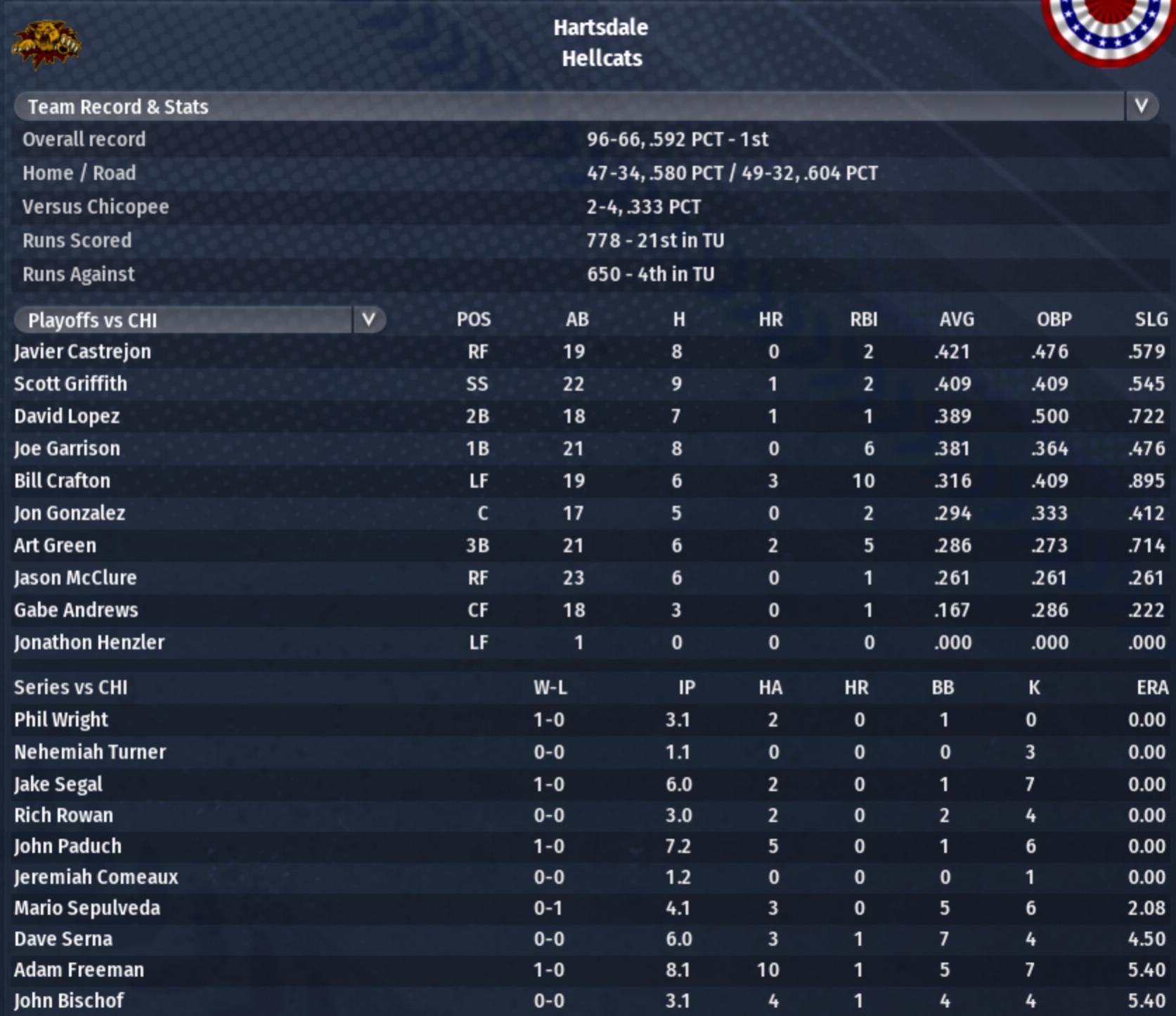 Three years ago, Chicopee was a surprise TU pennant winner, and then a Pro Cup champion. Could the Hartsdale Hellcats accomplish the same feat this year? The Cats have shocked the Tycobbian Union in their first ever postseason appearance to win their first pennant. They will be participating in Pro Cup XIV. |
