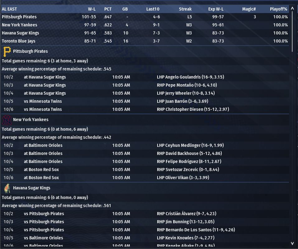 19-9 in our best winning % for any month this season and ties our most wins in a month. The Offense really stepped up in September but the pitching still had issues both in the rotation and in the pen, although the pen was great at times. We have 5 games remaining. We won the division and will face Anderson in the 1st round. We can beat them and beat Panasonic. We can most likely beat Atlantis. Not sold that we can beat Gotham City. We should get Jose Perez back the final game. Playoff roster will be decided after the season. The Pitching has been hit or miss