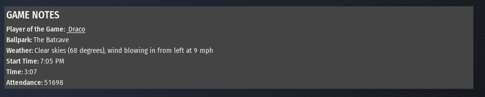 89-71 .556 7 GB AL East, tied for ALWC. 6-11 vs Gotham City The Batmen are fighting the sharks to be the 1st ALWC and have home field advantage in the wild card game. They are the only AL team that can knowingly defeat us and stop us from our 3rd consecutive Battle of Endor. They have a great mix of average, power, speed & defense along with great pitching especially with Al Screwball front runner Draco. The amount of LHP they have tend to shut down our hitters. We don't need to win this series but i would like to see us do better vs them then we have most of the season.