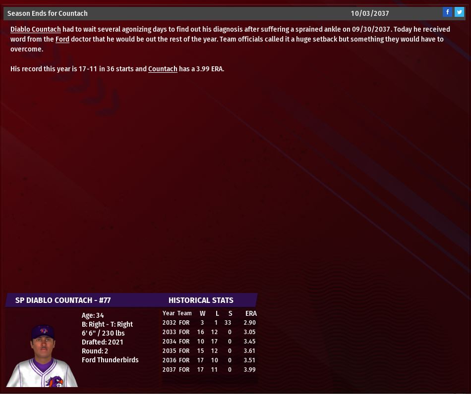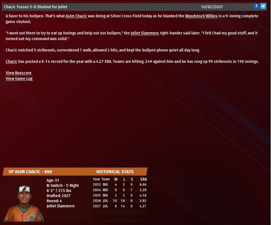 Joliet SP Asim Chaic pitched a 3 h 5 k bb CG SH. Ford Sp Diablo Countach will miss the next 2 months. Atlantis Sharks & Gotham City Batmen clinch the AL wild cards spots. Still fighting for #1 spot though.