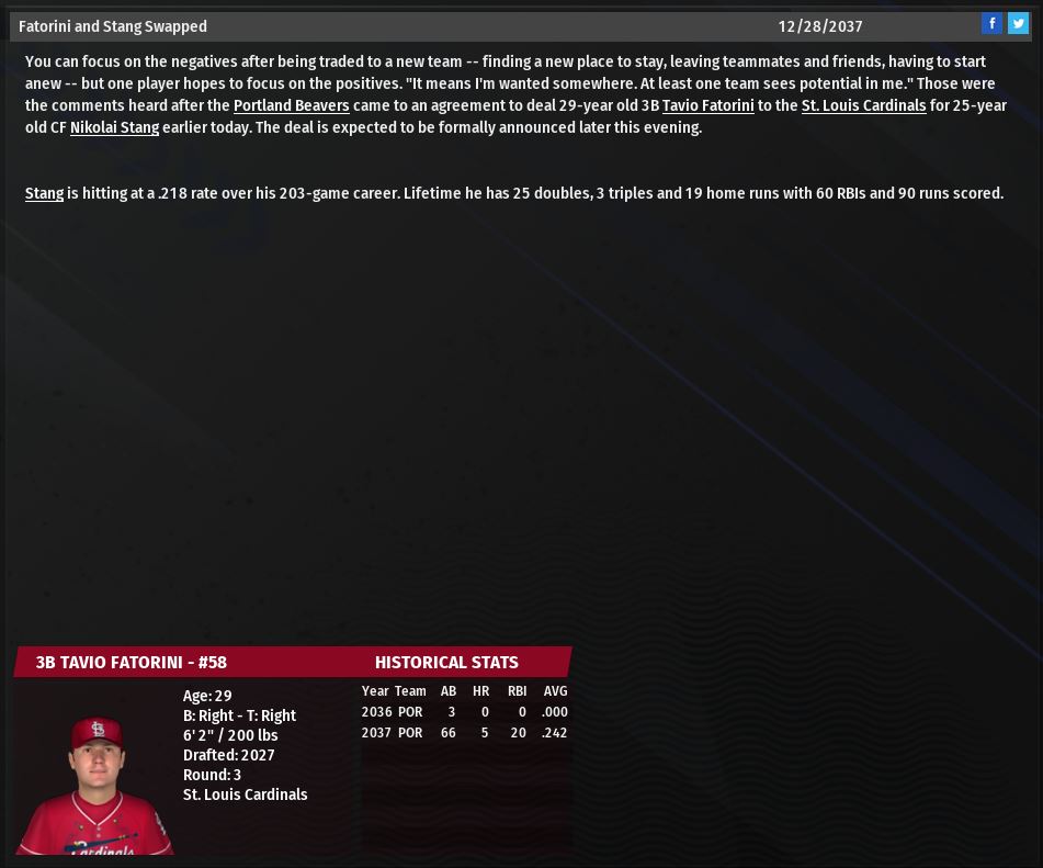 Portland Beavers traded 3b Tavio Fatorini to the St. Louis Cardinals for Cf Nikolai Stang.