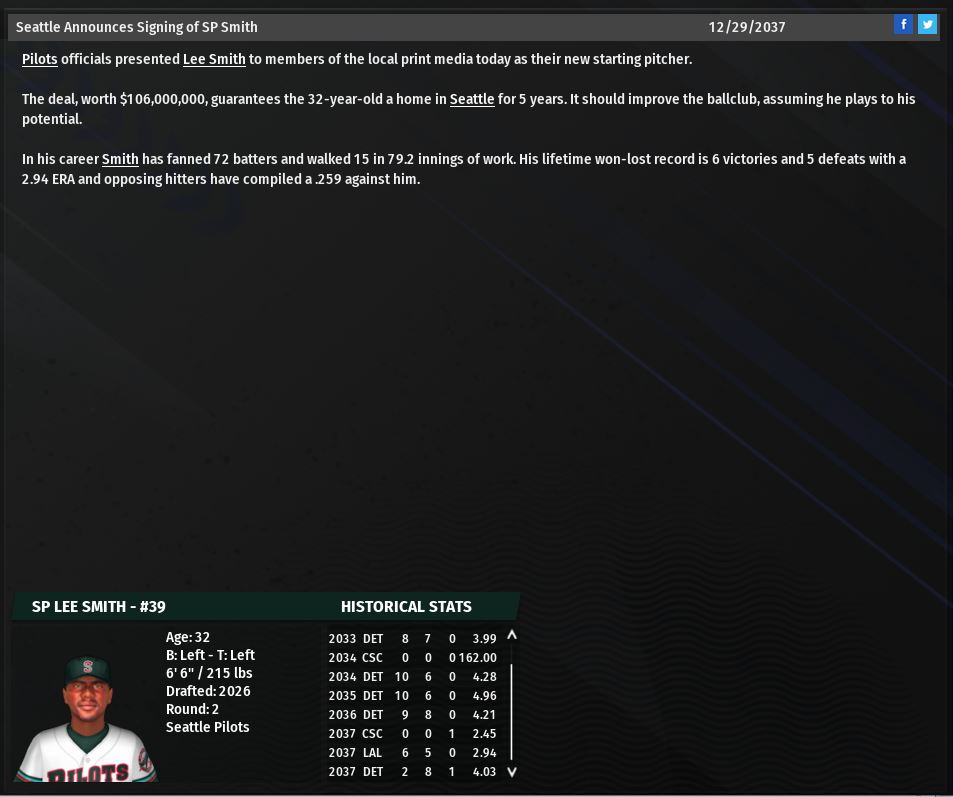 Seattle Pilots sign SP Lee Smith to a 5 yr deal.