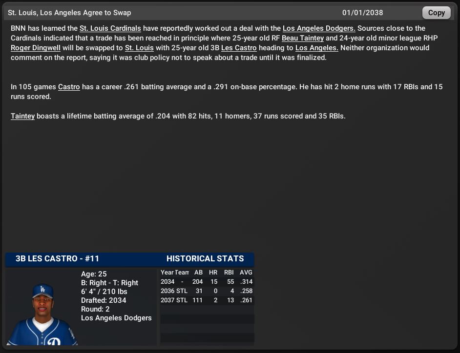 St. Louis Cardinals traded 3b Les Castro to the Los Angeles Dodgers for Rf Beau Tainley & a minor league SP.
