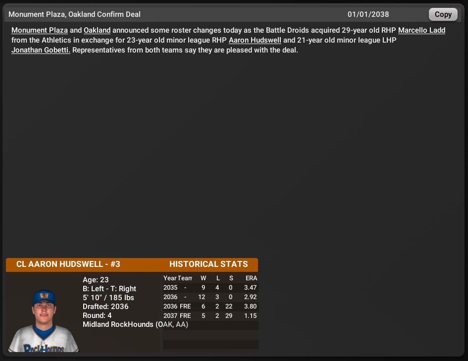 Monument Plaza Battle Droids traded 2 minor leaguers to the Oakland A's for RP Marcello Ladd.