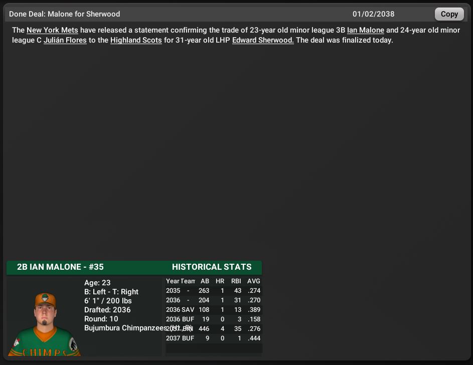 Coal City Coalers hire GM Jeremia Gomez to a 4 yr contract. San Antonio Stallions hire MGR Giandonato Antonelli to a 5 yr contract. Bird City Falcons traded P Clayton Knowles & a minor league P to the Schaumburg Boomers for Rp Joe Beckman.