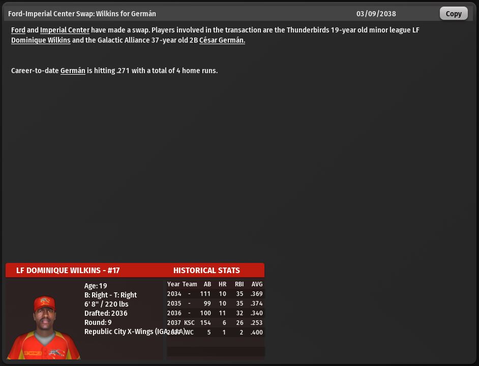 Marlboro Smoke sign Lf Vasco Patitucci to a 1 yr deal. Ford Thunderbirds traded a minor league Lf to the Imperial Center Galactic Alliance for 2b Cesar German.