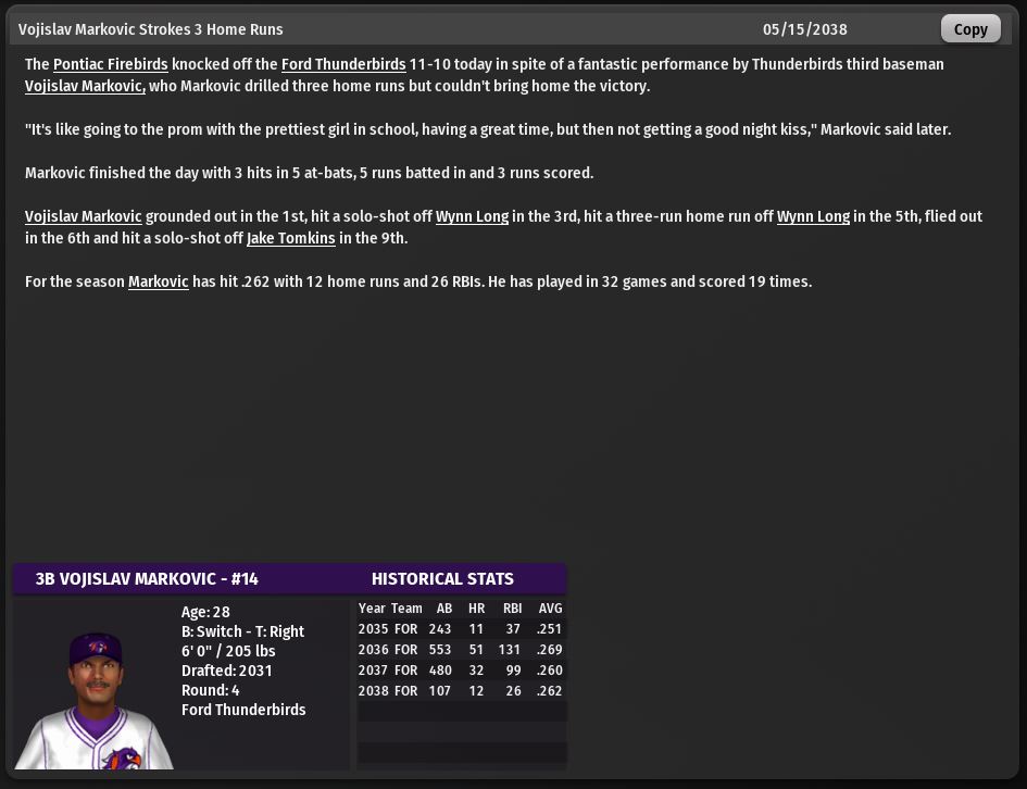 14-29 .326 12 GB AL West Not many good things that i can say about Madison. They haven't been competitive in many years and they traded away any player of value. Their minor league ranks in the lower 1/3rd. MGR Steve Willis is doing what he can but it's just not enough. On the positive side, they do have one of the best new parks in the EBL.