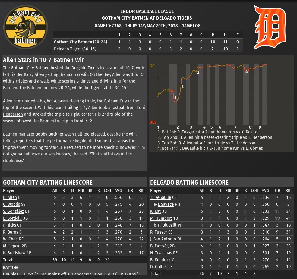 19-21 .475 10½ GB AL East 2-1 vs Gotham City The Batmen are struggling early on this season despite having the best SS in the EBL.Their Offense, Pitching & Defense all rank in the top 1/3 in the AL, so most likely they will turn their season around. Hopefully not against us though. SS Mercedes Benz has struggled offensively since she 1st came up and was out of options. P Dave Baldwin, although a rookie was struggling and with the misc injuries, i needed another reliable bullpen arm. RP Alfredo Gomez is under contract for several more seasons. RP Jeremiah Bullfrog was DFA'd. If no one claims him, he will rejoin us and someone else will be sent down or a trade will be made.
