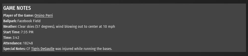 Took 2 of 3 vs Chevy then split @ Atlantis. Played the 1st 2 games @ ATS in Octopus Garden while a leak in the dome was repaired then got to see The Shark Tank for the final 2 games. Nice park overall but lacks the closeness of OG. There will be several new parks or renovations next year. Gotham City, Panasonic, Ford & us will all have stadium renovations. Cloud City will get a new park. We host a sub. 500 GC team for 4 games before going to a bad Madison team for 3. Rotation was hit or miss this week. Pen did great overall, although a few struggled. Nikolo seems great so far. Perch has a 12 game hitting streak. Kennett is battling the flu and hasn't played much the lat few days but had a great week. Only players that struggled were Benz, Humbert & Eidsvag. Changed up our logos and uniforms. This was a design that was made for Delgado some time ago. We will wear them through 2040