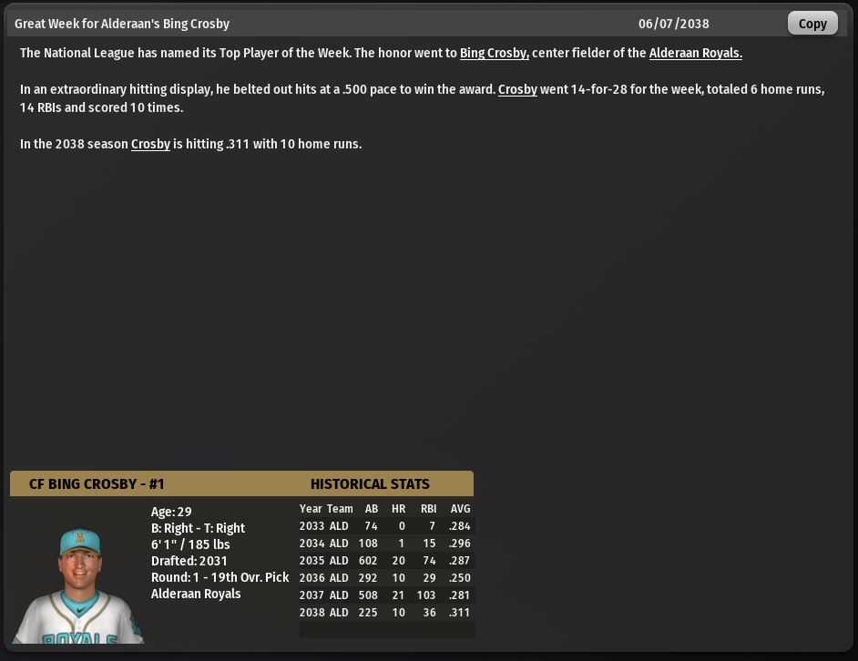 Council Rf Mala Burnu is named UBL GL POTW. Atlantis Cf Reggie Simmons is named EBL AL POTW. Alderaan Cf Bing Crosby is named NL POTW.