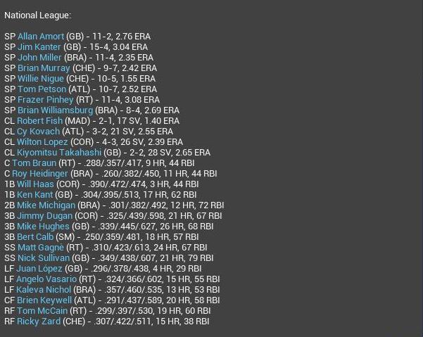Dwayne Edwards, C, Chevy was injured. Broken finger, this was a predetermined injury. He will miss the rest of the regular season. Dave Alfsen, 1B Brandywine also will miss the rest of the regular season also with a broken finger. The 2 *** will be featured in the future. I don't get signing a 1B when you are out of playoff contention when you already have an all star 1B. Cummings may help Corvair.