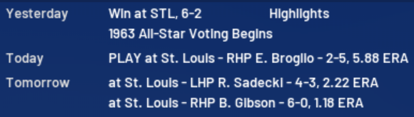 Jack Sanford just keeps proving me wrong when I took him in the offseason. I thought he was the best acquisition I made. He better have a better year in 1964. Meanwhile, CHC Don Prince just ran over us in this game. My owner thinks I stink. Yeah, he's right.