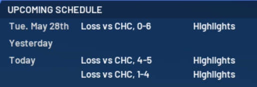 Not a thing. We stink, we are lousy and I might be losing my job in only my second year of this thing. I also lost Bob Skinner for almost a month. My Minors are still very empty because of the early years of the franchise. I brought up Bob Uecker to fill out the bench.