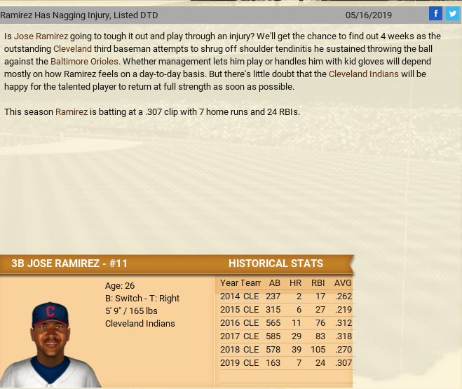 In MLB news - Cleveland 3B Jose Ramirez is dealing with a nagging shoulder tendonitis injury. Team officials are watching and monitoring Ramirez, but he says he will play through it "unless it gets worse" BNN is keeping an eye on this story. |