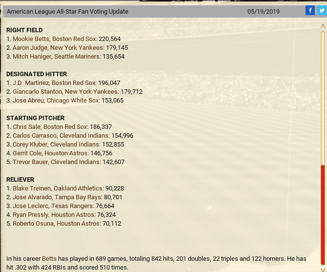 A few players are called into the Mgr.s office and come out looking glum, Jake Marisnick comes out angry and cleans out his locker, although he doesn't say anything to the other players but "See ya Bro." ![]() The highlights for the week are the two victories we earned in ARZ. The lowlights? You just pick any from the "San Diego Debacle"... The roster moves for the week; 1) 5/13 Traded LF Corey Dickerson, minor league SP Steven Brault to SF in exchange for SP Madison Bumgarner, minor league RP Jaime Callahan, placed P Bumgarner on 25 man roster. 2) 5/13 Traded SP Jordan Lyles to HOU in exchange for CF Jake Marisnick, minor league OF Myles Straw, placed CF Marisnick on 25 man roster. 3) 5/15 P Matt Wisler optioned to AAA Indianapolis. 4) 5/17 OF Chisenhall put on 20 day rehab option at AAA Indianapolis. 5) 5/17 RP Kyle Crick put on 10 IL retroactive to 5/16. 6) 5/17 Purchased contract of RP Blake Weiman and placed on 25 man roster 7) 5/19 CF Jake Marisnick placed on unconditional waivers and taken off the 40 man roster. 8) 5/19 1B Erich Weiss sent down to AAA. 9) 5/19 Purchased the contract of 1B Nick Franklin and placed him on 25 man roster. 10) 5/19 Promoted OF Pablo Reyes from AAA to 25 man roster. There was no shouting, no outbursts - just Jake Marisnick flatly refusing an option to the minors, as is his right. But GM Moore explained that a .100 BA coming into the team, then merely hitting .176 is sufficient grounds to ask a player to go to AAA to work on their swing. With Marisnick's refusal and OF Pablo Reyes swinging a hot bat in AAA, it made the decision easier for GM Moore and Mgr. Clint Hurdle agreed. |