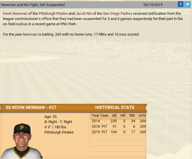 SS Kevin Newman gets off lucky at only a three game suspension, He tried to fight everyone on the Padres when he got hit yesterday.