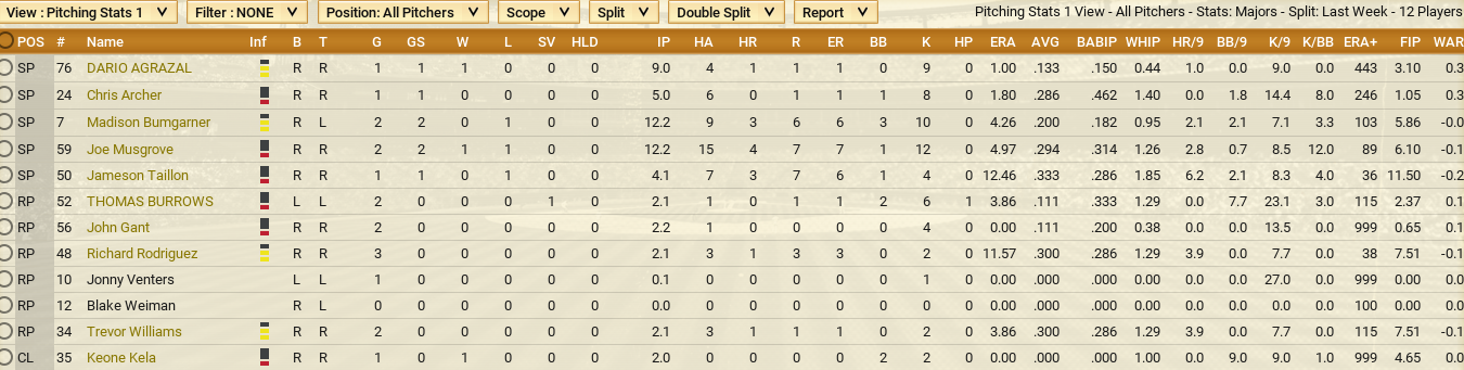 the team batting average this past week wasn't bad, the ability to drive in runs is ATROCIOUS!!! Finally I don't know who is keeping OOTP 20 stats but they need a vacation! They list my pitching staff as having three wins this week when the schedule and win column only show two??? |