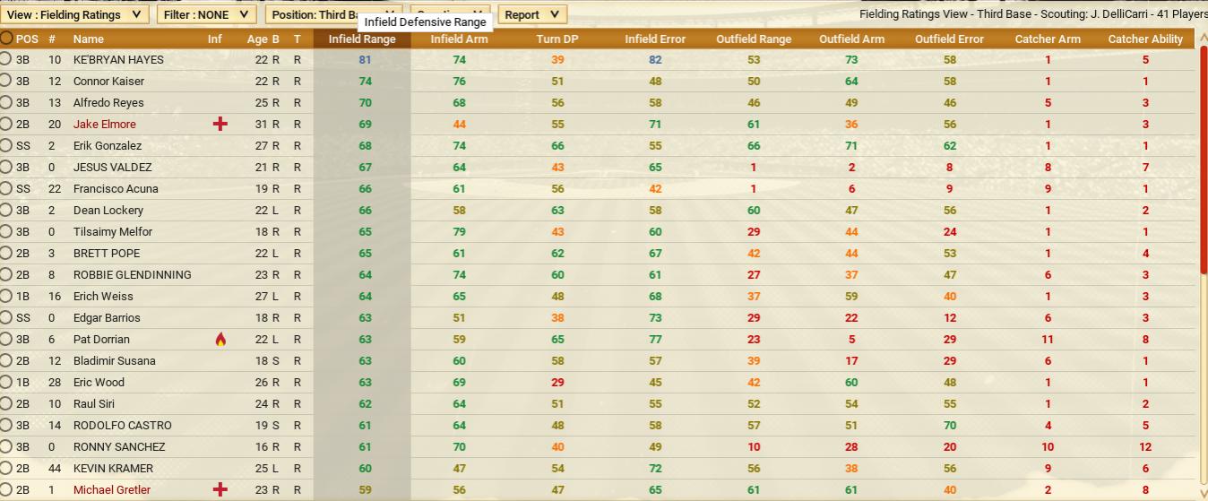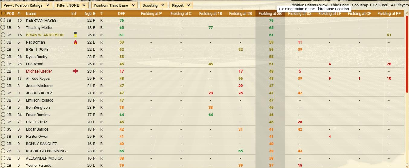 Top 5 1) Ke'Bryan Hayes - A 22 y/o starter at AAA. Clearly our best defensive player already, KeBryan rules all the defensive metrics for the position. He is still maturing as a batter and shows promise, we just do not want to rush him up with Brian W Anderson manning third currently. (Contact 40/61 - Gap 31/49 - Power 27/38 - Eye 46/59 - Avoid K's 44/53) 2) Brian W Anderson - A 26 y/o starter at 3B. Quality defense and offense metrics make him an above average MLB 3B. (Contact 54/56 - Gap 46/46 - Power 45/45 - Eye 72/77 - Avoid K's 56/57) 3) Erik Gonzalez - A 27 y/o IF, scouts report Erik Gonzalez could be an average 3B if he played there specifically, since he is an IF his defensive metrics at 3B are slightly above average, but his position rating is poor. (Contact 42/42 - Gap 53/53 - Power 36/36 - Eye 12/13 - Avoid K's 44/44) 4) Alfredo Reyes - a 25 y/o IF, he is a slightly below average defensive 3B but his metrics are above average, he is a more natural 2B but he is stuck at AA at both of his positions. (Contact 29/36 - Gap 17/25 - Power 16/17 - Eye 47/52 - Avoid K's 53/58) 5) Eric Wood - 1 26 y/o reserve at AAA. Eric is an average defensive 3B with some mental lapses leading to unforced errors. He is a primary 1B in his defense, but he has several lower level players pushing for his job which he has held on to so far. (Contact 29/32 - Gap 48/48 - Power 43/44 - 39/43 - Avoid K's 35/40) Eric's OSA ratings are kinder, but not majorly so. There are at least 4 players in the low minors who could fill out and get on the top 5 list in a few years if their skills blossom as expected. |