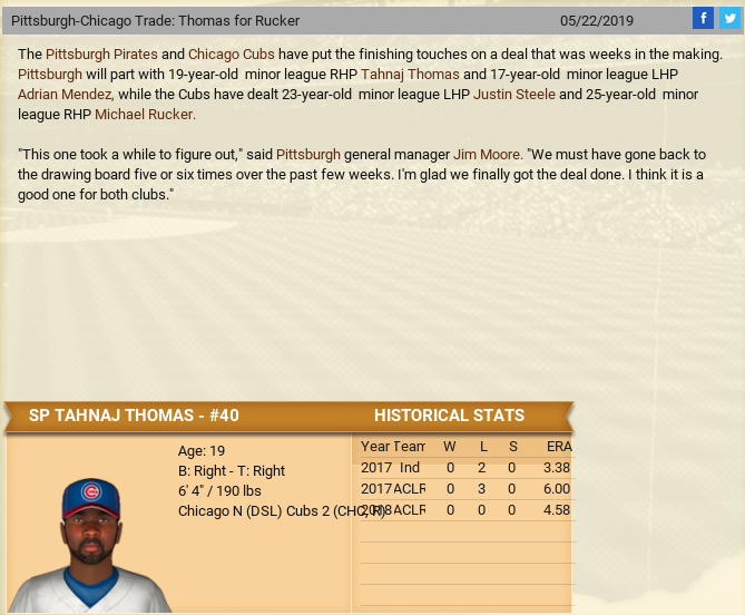 GM Jed Hoyer calls with an offer I CAN refuse! Then I take a look around to see what he has available under the Cubs hood, We end up striking a minor league deal for 2 almost ready for prime time pitchers coming from Chicago(N) for 2 prospects aged 17 & 19 y/o...