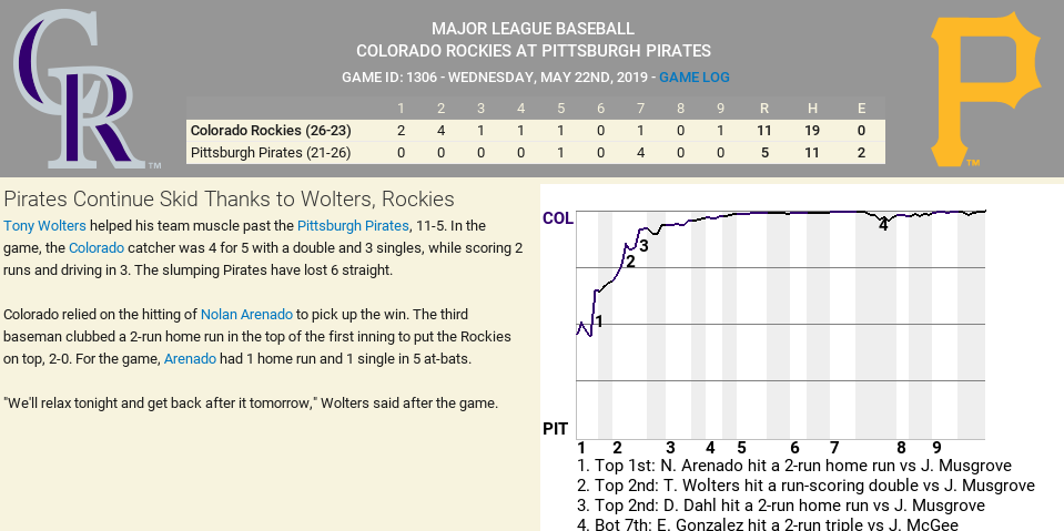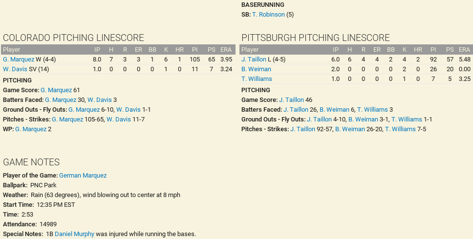 Another loss, but Rockies LF David Dahl was his own human highlight film. Box Score says it all, pretty much followed the predictions made before the series, too much offense for the Pirates to overcome.