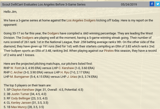 The meeting went well for the most part, Jake and his agent insisted they would not consider a stint in the minors. GM Moore reached in his desk and pulled out an envelope, handing it to the agent. "That's your client's release from the organization, the balance of monies owed under his contract, and I wish you both well with your careers. Thank you for your service to the Pirates." The agent seemed stunned, looked in the envelope quickly then said "I'm sure we can come to some other agreement..." Jake tapped his arm and said "lets go" and they left the office. Moore sat back down in his chair, sighed and asked if anyone had anything to say.. Coach Prince laughed and said "In my day I woulda CRAWLED to Indianapolis to still wear the uniform..." ![]() In other news RP Thomas Burrows was optioned to AAA Indianapolis and P Wilmer Font was activated off the DFA list and placed on the 25 man roster. Pitching coach Joel Hanrahan accepted a three year contract to be the Pirates pitching coach. 5/23 The scouting report for the weekend at home playing the Dodgers is below. |