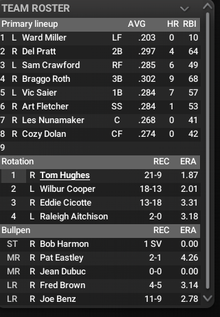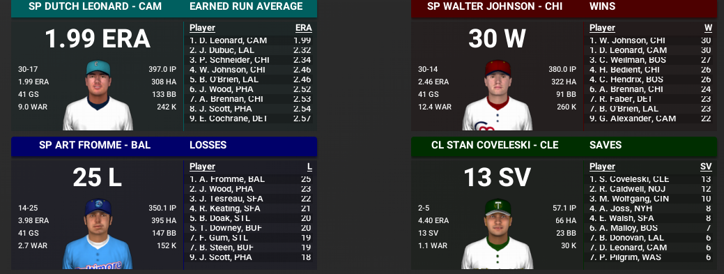 Joe Jackson (.379, 14 HR, 115 RBI) and Ty Cobb (.368, 119 RBI) both had monster seasons for New York but it was not eough. They could never really find anyone for the #3 or #4 spot in their rotation and wound up 13th in ERA. Dutch Leonard won 30 games as a rookie for a surprising Cambridge Schooners team that won 90 games. But it will be Boston and Chicago in the Series as the Midways found a way to get it done without Cobb and will make their 4th straight World Series appearance. For Boston, it is their first time back in the Series since 1905.