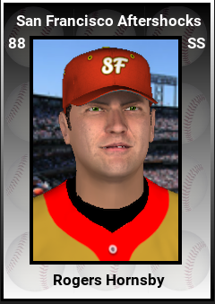 San Francisco got lucky last year as St. Louis took an also-ran and let Babe Ruth drop to #2. This year the Aftershocks had the top pick and SF did not miss, picking Rogers Hornsby in the #1 overall slot. That said, another mediocre season in New York has proved that having two ultrasuperstars does not necessarily mean a pennant. The Highrisers are 55-53 even with Shoeless Joe and Ty Cobb mashing the ball.