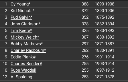 It will be interesting to rewrite some of the most famous leaderboards. One I am interested in is the all-time wins leader. In the MLB it was Cy Young 511, Johnson 417, Matthewson and Pete Alexander at 373.