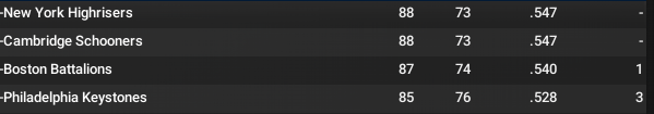 It seemed like Boston had the Eastern League in hand but it winds up as a wild finish with four teams competing down the stretch. Philly may have actually been the best of the four, but they finish 4 games off the pace. It came down to a three game series between New York and Cambridge with the two teams tied on the final day. But New York wins it and they head to their second World Series despite really having any strong pitchers.
