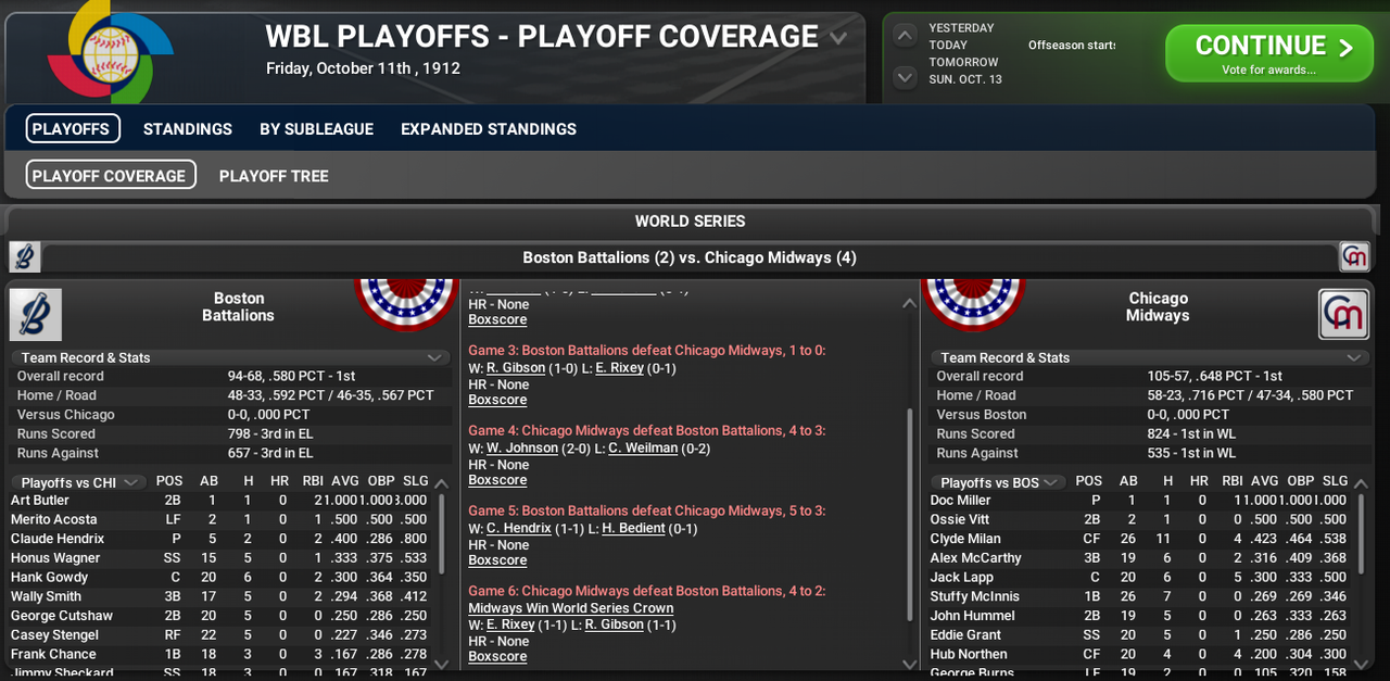 The Chicago Midways accomplish something special after losing Ty Cobb to free agency. Despite the loss, Chicago wins their league by 7 games over LA and then beats Boston 4 games to 2 to take their 3rd championship in 4 years. Clyde Milan hit .423 to win the Series MVP but Walter Johnson won 2 games after winning 30 in the regular season. He seems likely to win his 4th Ace Award in a couple of days.